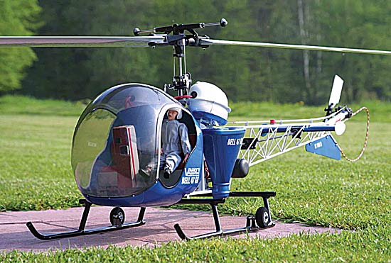 sehen Sie z.B. das spezielle Landegestell, das Cockpit und den Semi-Scale- Rotorkopf. Der Heck- rotor sitzt hier wie beim Original in Flugrichtung rechts.