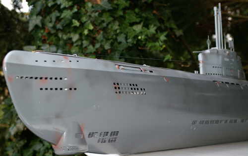 Auch bei diesem Modell sind die Flut- schlitze vorgefertigt um dem Modell- bauer zeitraubende Bohr- oder Fräs- arbeiten zu ersparen. Im Gegensatz zur U-47 werden die vorderen Tiefenruder nicht mechanisch über ein Paddel, sondern per Servo angesteuert. Wer möchte, kann diese vorderen Tiefenruder zur Überwasser- fahrt genau wie beim Vorbild fernge- steuert einklappen.